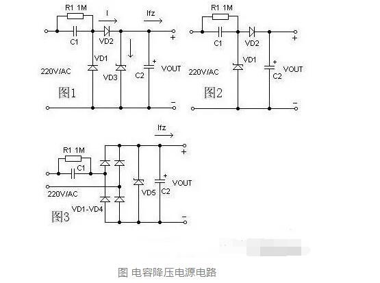 电容降压式简易电源的基本电路如图1,C1为降压电容器,D2为半波整流二极管,D1在市电的负半周时给C1提供放电回路,D3是稳压二极管,R1 为关断 电源后C1的电荷泄放电阻。在实际应用时常常采用的是图2的所示的电路。当需要向负载提供较大的电流时,可采用图3所示的桥式整流电路。整流后未经稳压的 直流电压一般会高于30伏,并且会随负载电流的变化发生很大的波动,这是因为此类电源内阻很大的缘故所致,故不适合大电流供电的应用场合。