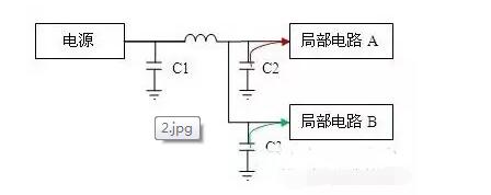 图中电源为A和B供电。电流经C1后再经过一段PCB走线分开两路分别供给A和B。当A在某一瞬间需要一个很大的电流时,如果没有C2和C3,那么会因为线路电感的原因A端的电压会变低,而B端电压同样受A端电压影响而降低,于是局部电路A的电流变化引起了局部电路B的电源电压,从而对B电路的信号产生影响。同样,B的电流变化也会对A形成干扰。这就是“共路耦合干扰”。