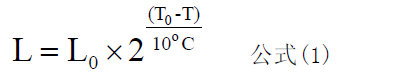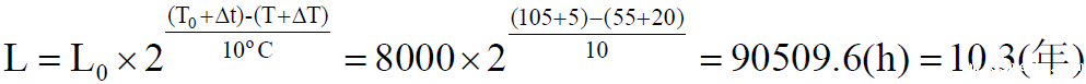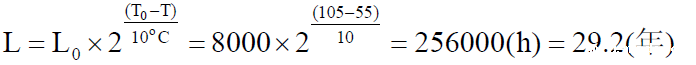 根据阿列纽斯方程结论可知,电解电容使用寿命计算公式如下: